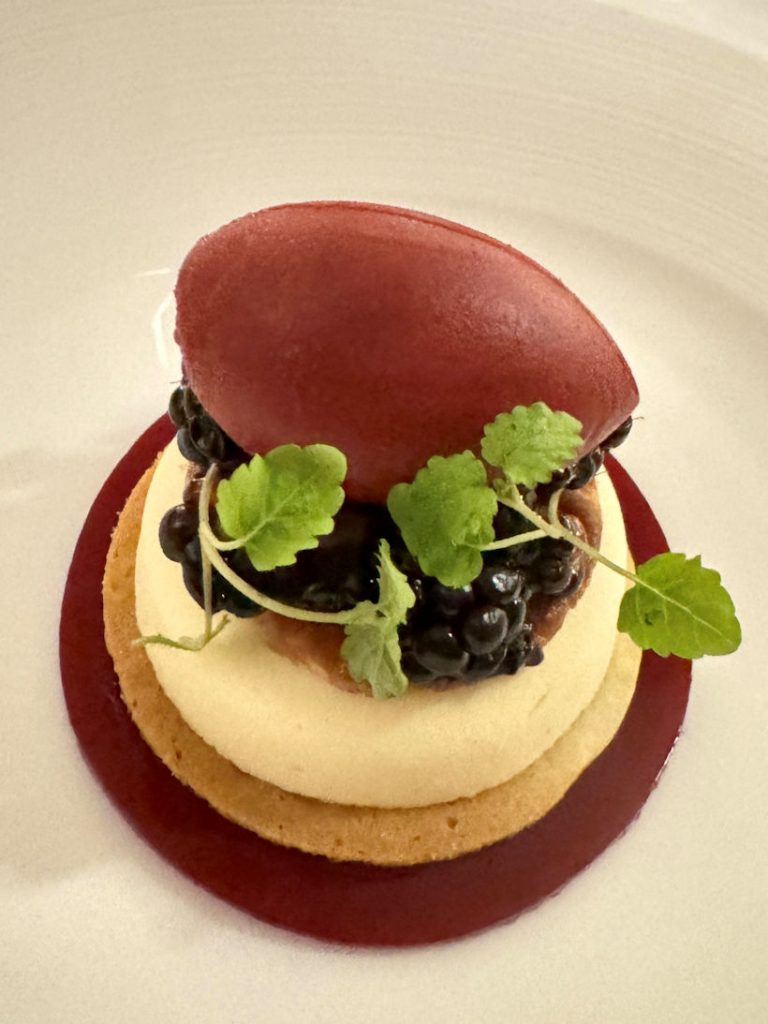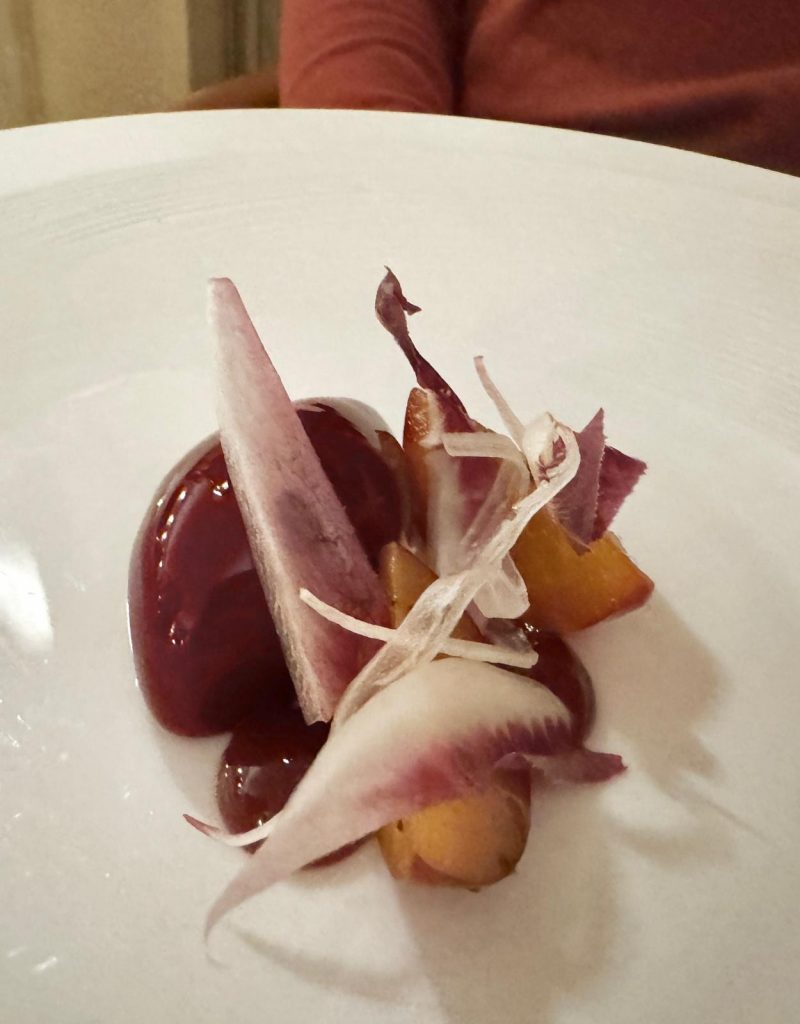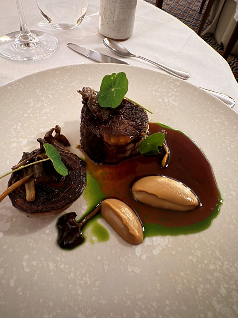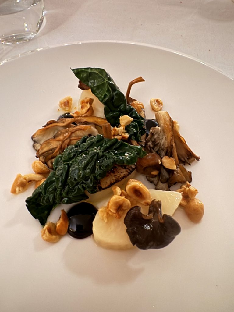 The salt-baked celeriac was a masterpiece. The gentle cooking method preserved the vegetable’s natural sweetness and enhanced its earthiness. The addition of maitake mushrooms, black garlic, and hazelnuts created textures and fabulous taste sensations that we will remember for a long time. The dish was a testament to the chef’s skill and creativity, showcasing the versatility of a humble root vegetable.